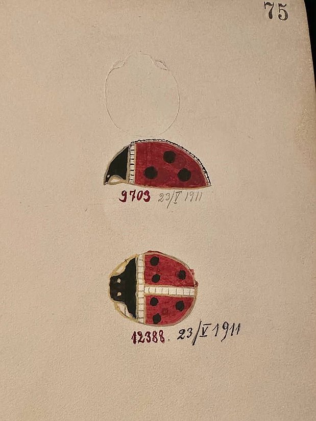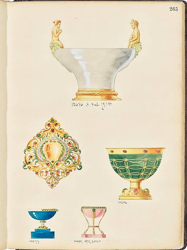 Содержание: На страницах запечатлены более 1000 эскизов в натуральную величину. Это не просто акварельные рисунки, а детальные производственные чертежи с указанием инвентарных номеров и дат. Для исследователей это своего рода «Розеттский камень», позволяющий атрибутировать сотни изделий, история создания которых ранее была неизвестна.
