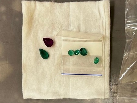 Первый пассажир использовал изощренную схему маскировки. В его чемодане был обнаружен запаянный пакет с кремообразной массой, куда он спрятал четыре зеленых камня. Дополнительно, на дне рюкзака находились еще один розовый и два зеленых камня. Во время личного досмотра мужчина «добровольно» извлек из своего кошелька еще семь камней: четыре зеленых, два розовых и один синий. Второй пассажир оказался менее изобретательным — в его ручной клади был найден крупный розовый камень.