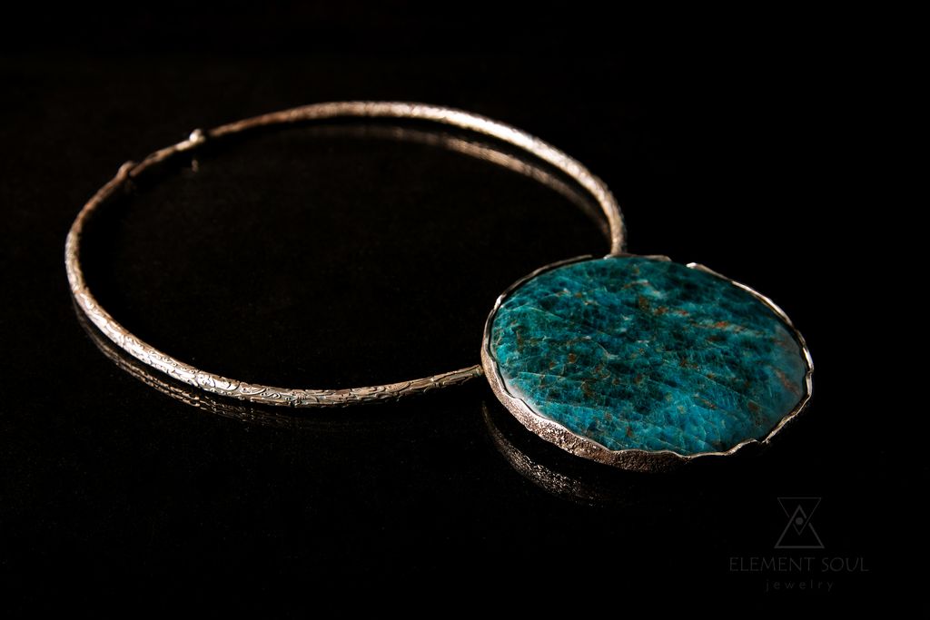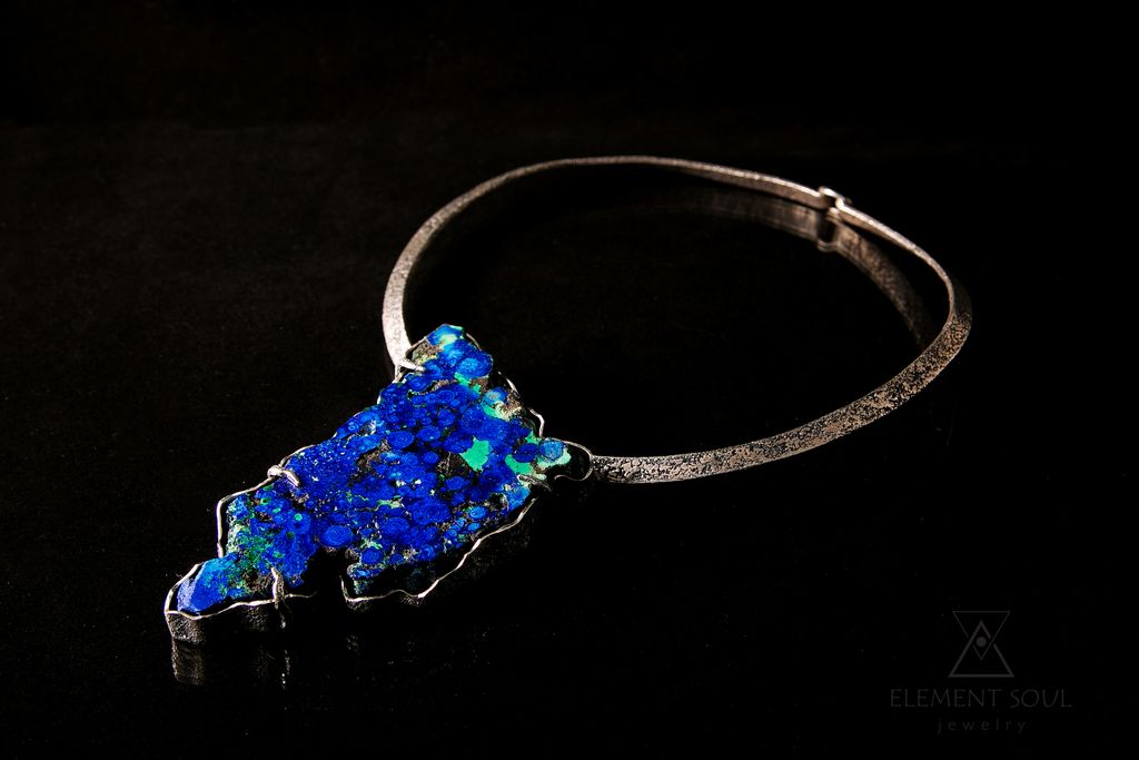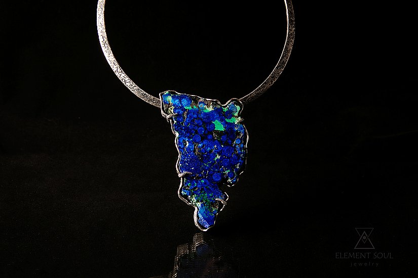 Материалы и техники: Выполнен в серебре 925 пробы со вставкой крупного спила азурмалахита природной формы. Изделие создано полностью вручную, патинировано, с текстурированием по серебру и выпиловкой. На оборотной стороне выполнена выпиловка по металлу.