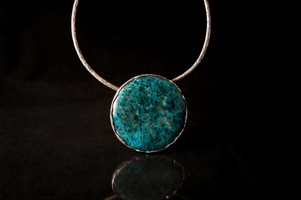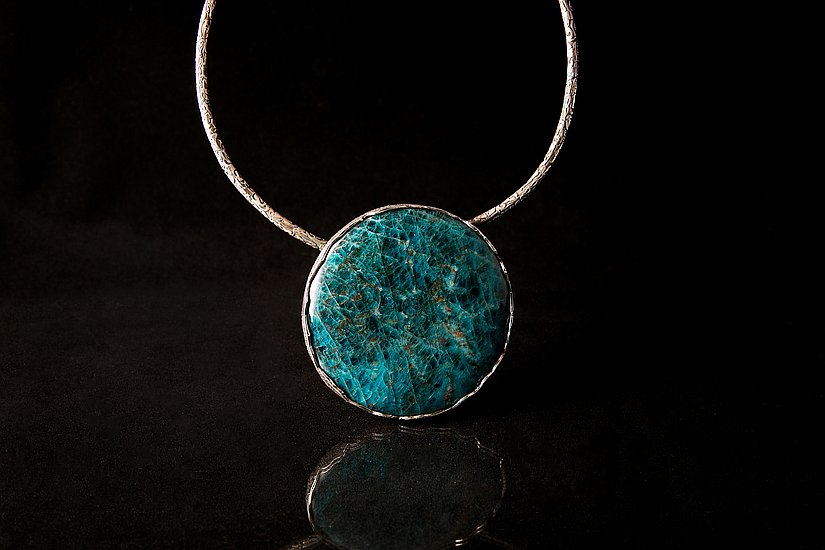 Материалы и особенности: Серебро 925 пробы со вставкой апатита диаметром 7 см в центре. Работа выполнена вручную, текстурирована, патинирована и с выпиловкой. На основе выполнена гравировка в «зверином стиле» (животные сибирской фауны), а на оборотной стороне — стилизованное изображение скифского барса.