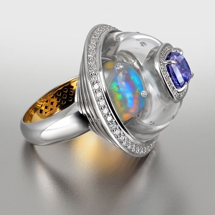 Материалы и техника: Комбинированное золото 585 пробы (белое и жёлтое), эфиопский опал, находящийся под куполом из горного кварца, закреплённые на куполе танзанит и россыпь бриллиантов.