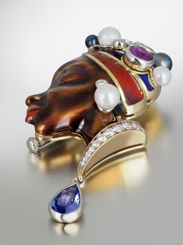 Идея: Арлекины, развлекающие публику. Английский замок (швенза) повторяет очертания купола цирка, а драгоценные камни закреплены под разными углами для передачи игривости.