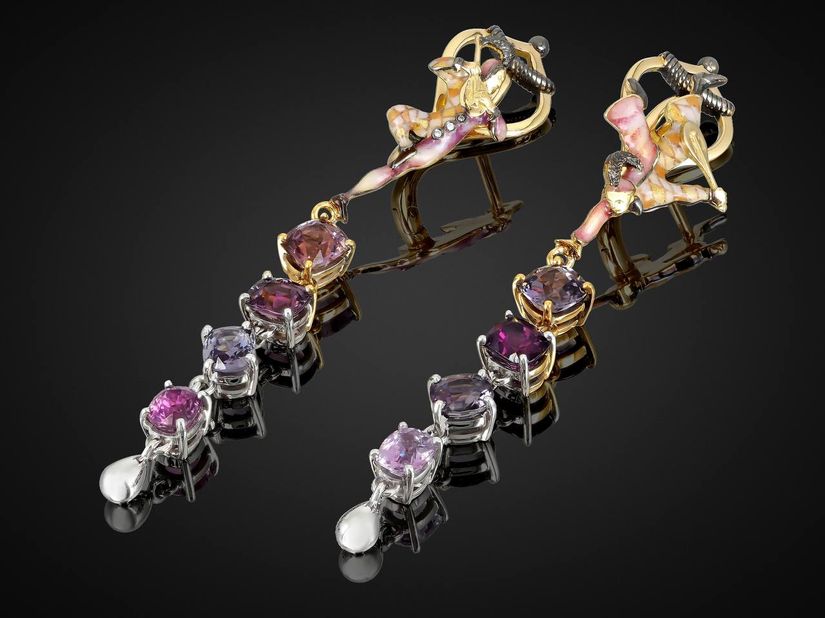 Материалы и техника: Комбинированное золото 750 (основа) и 585 (подвесные элементы) пробы, перегородчатая горячая эмаль, вставки природной шпинели разных оттенков.