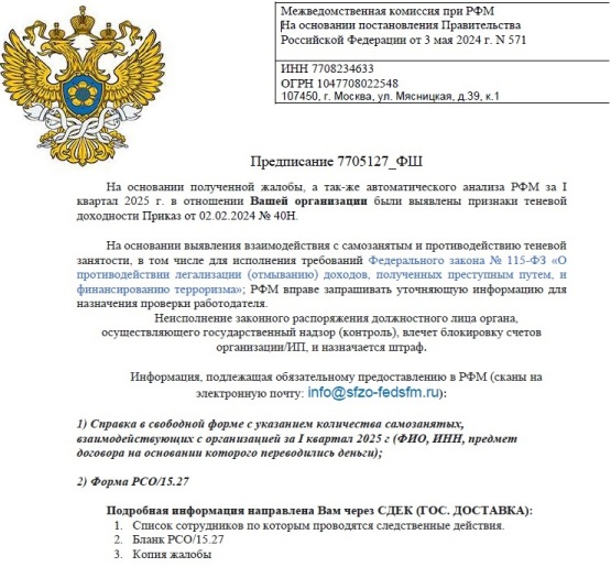 Важно: Государственные органы (Росфинмониторинг, Прокуратура, ФНС) никогда не отправляют предписания через коммерческие курьерские службы (СДЭК, Boxberry и др.) с требованием оплаты получателем через мессенджеры или QR-коды. Официальная переписка ведется через Личный кабинет на сайте РФМ, Почту России (заказными письмами) или по защищенным каналам ТКС.