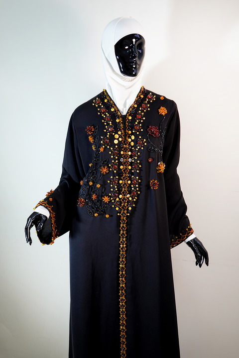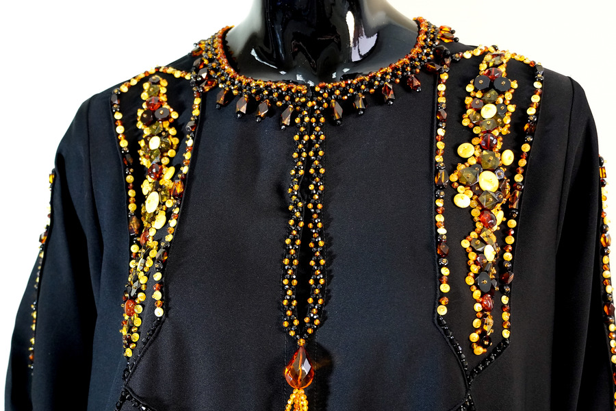 Выставленные на аукцион абайи представляют собой стильные длинные черные одеяния свободного покроя с длинными рукавами. Каждое платье вручную расшито янтарем по индивидуальному эскизу. Узоры, имитирующие этнические орнаменты, цветы, украшения, различные виды плетения, выполнены с использованием янтарных бусин, цветовая палитра которых простирается от золотисто-медового до угольно-черного.