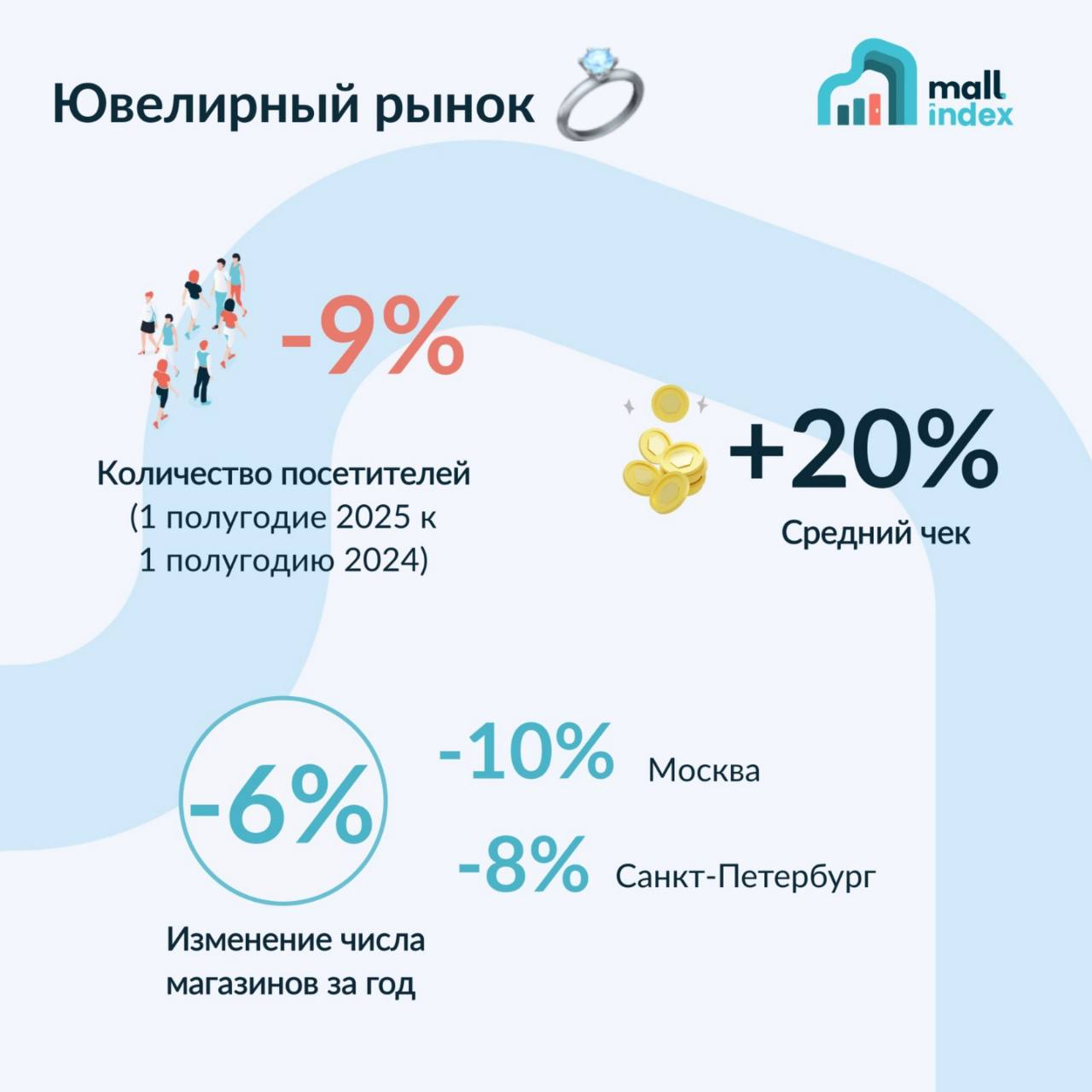 За последний год количество ювелирных магазинов по всей стране сократилось на 6%, и сейчас их осталось 15 365. В крупных городах этот тренд выражен еще сильнее: в Москве число торговых точек уменьшилось на 10%, а в Санкт-Петербурге — на 8%. Одновременно с этим, в первом полугодии 2025 года по сравнению с аналогичным периодом 2024 года, количество посетителей ювелирных магазинов упало на 9%.
