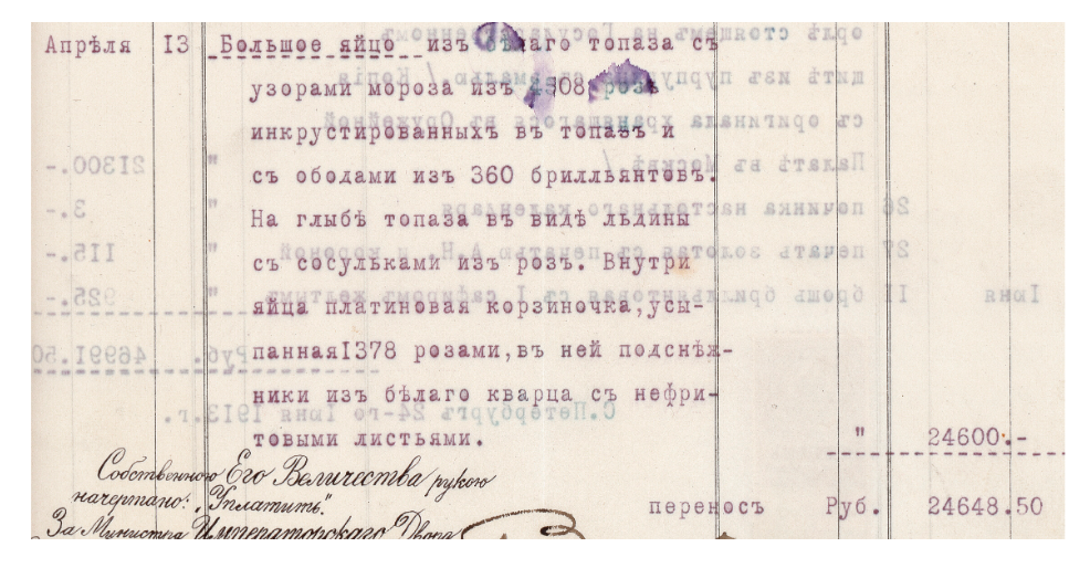 The auction house Christie’s recently sold a supposed 1913 Imperial "Winter Egg" to the firm Wartski, but evidence suggests the piece is a sophisticated fake. In an apparent oversight—perhaps blinded by the prospect of a massive commission—Madame Margot Oganesian, Director of the Russian Department at Christie's, included a photo of the original Royal invoice in the lot’s documentation. That very document, written in Russian, fundamentally contradicts the physical attributes of the auctioned item.