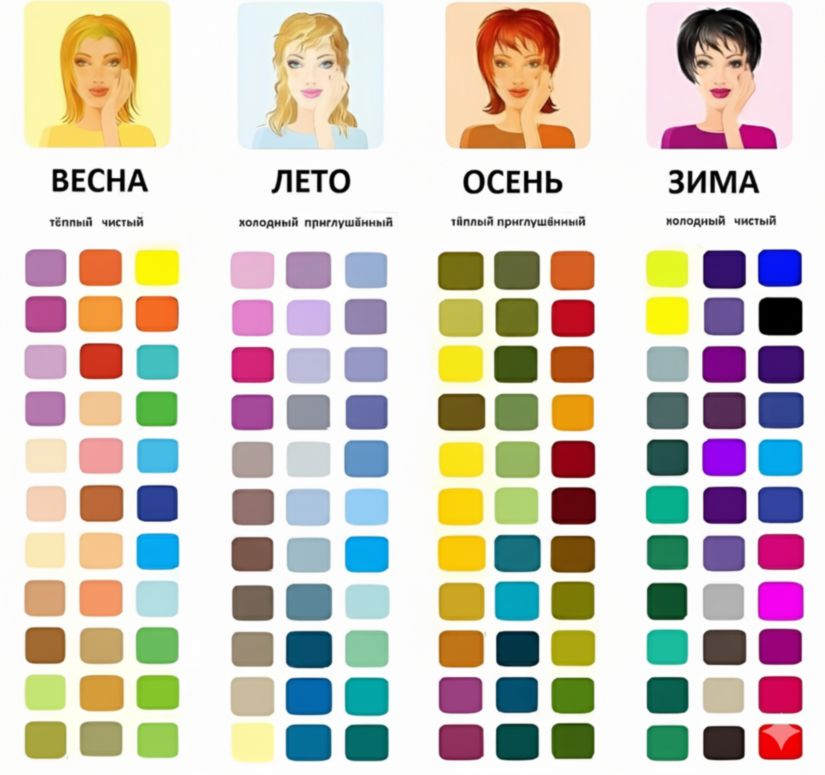 | ☀️ Весна | Теплый, чистый, светлый. Кожа: персиковая, с золотистым подтоном. Волосы: золотистый блонд, светло-русый. Глаза: голубые, зеленые. | Теплые, светлые, чистые оттенки: Желтое/красное золото. Жемчуг (кремовый), аквамарин, цитрин, хризолит, нежный коралл, светло-бирюзовый. |