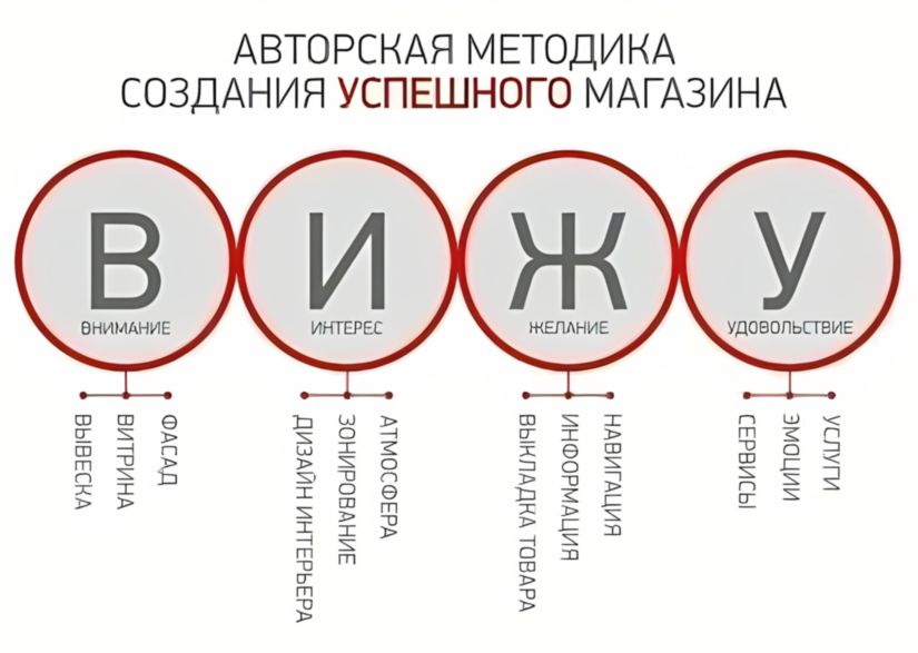 Методика ВИЖУ — это авторский акроним (аббревиатура), описывающий пошаговую модель взаимодействия розничного магазина с покупателем с целью доведения его до покупки и обеспечения лояльности. Она охватывает все этапы — от внешнего оформления до послепродажного сервиса.