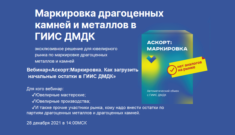 Вебинар «Аскорт:Маркировка. Производство. Как загрузить начальные остатки в ГИИС ДМДК» пройдет 28 декабря 2021 года в 14.00 по московскому времени.
