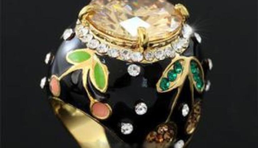 1. Кольцо "Грация" с кристаллами Swarovski и стильным покрытием из черной эмали. Размер кристалла Swarovski цвета шампанского в кольце просто гигантских размеров: 1.4 х 1.4 см. Основной камень подчеркивается мягкой подсветкой обрамления из кристаллов Swarovski прозрачного цвета. Остальная поверхность кольца украшена позолоченными изображениями гроздей вишни покрытых эмалья зеленого и розового цвета, а также кристаллами Swarvoski.