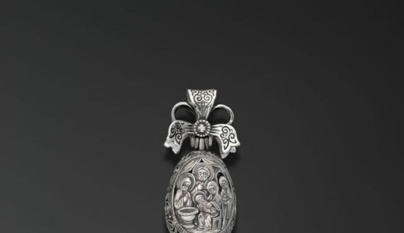 Возрождая традиции прошлого, Владимир Михайлов создает уникальные по красоте и смысловой наполненности ювелирные украшения, отсылающие к многозначительному православному празднику. Филигранно выполненная нательная икона в виде пасхального яйца «Рождество Пресвятой Богородицы» завораживает каноническим, ювелирно исполненным библейским сюжетом. Обтекаемая форма изделия задает общий ритм и звучание символичной композиции, где на оборотной стороне можно видеть Богородицу с Сыном на правой руке, а в левой - цветок белой лилии как олицетворение неувядаемой непорочности.