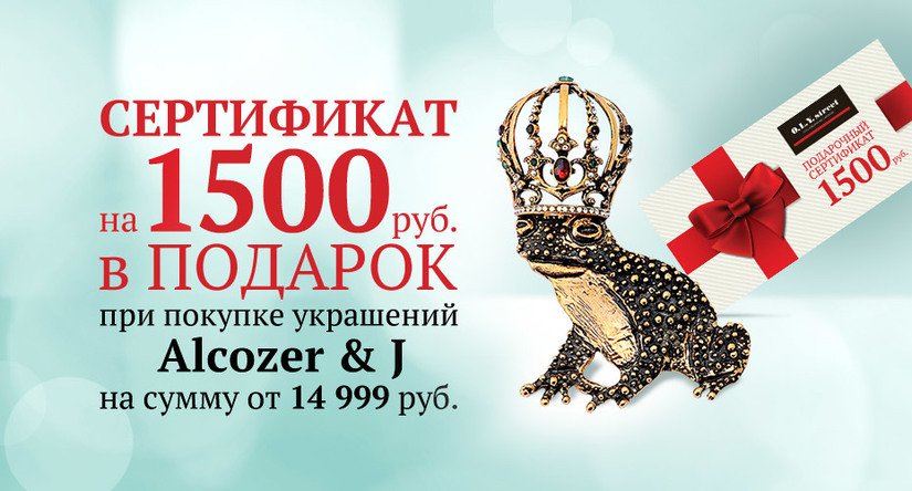 Приобретая бижутерию итальянской фирмы Alcozer & J на сумму от 14 999 руб., вы получаете подарочный сертификат номиналом 1 500 руб. для последующих покупок*.