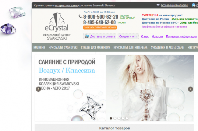 Ее ассортимент насчитывает свыше 10 000 наименований, по каждому продукту консультанты дадут исчерпывающую информацию и помогут определиться с выбором. В наличие имеются: пришивные, термоклеевые, клеевые и ювелирные кристаллы SWAROVSKI® ELEMENTS, искусственный жемчуг и бусины SWAROVSKI® ELEMENTS, интерьерные кристаллы, тату и наклейки из кристаллов, браслеты и многое другое. Приобрести продукцию можно в розничном магазине, оптовом офисе и в интернет-магазине http://ecrystal.ru/ Доставка осуществляется по всей территории России.